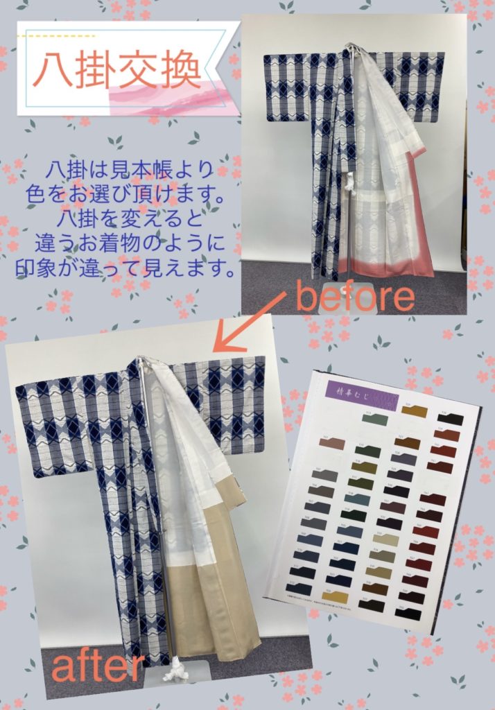 ピンクのぼかし八掛から、ベージュ系の八掛に交換し、落ち着いた印象になり、お客様にもとても喜んで頂きました。