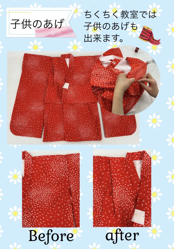 ちくちく教室では、お子様の肩揚げや腰揚げなども行っています。