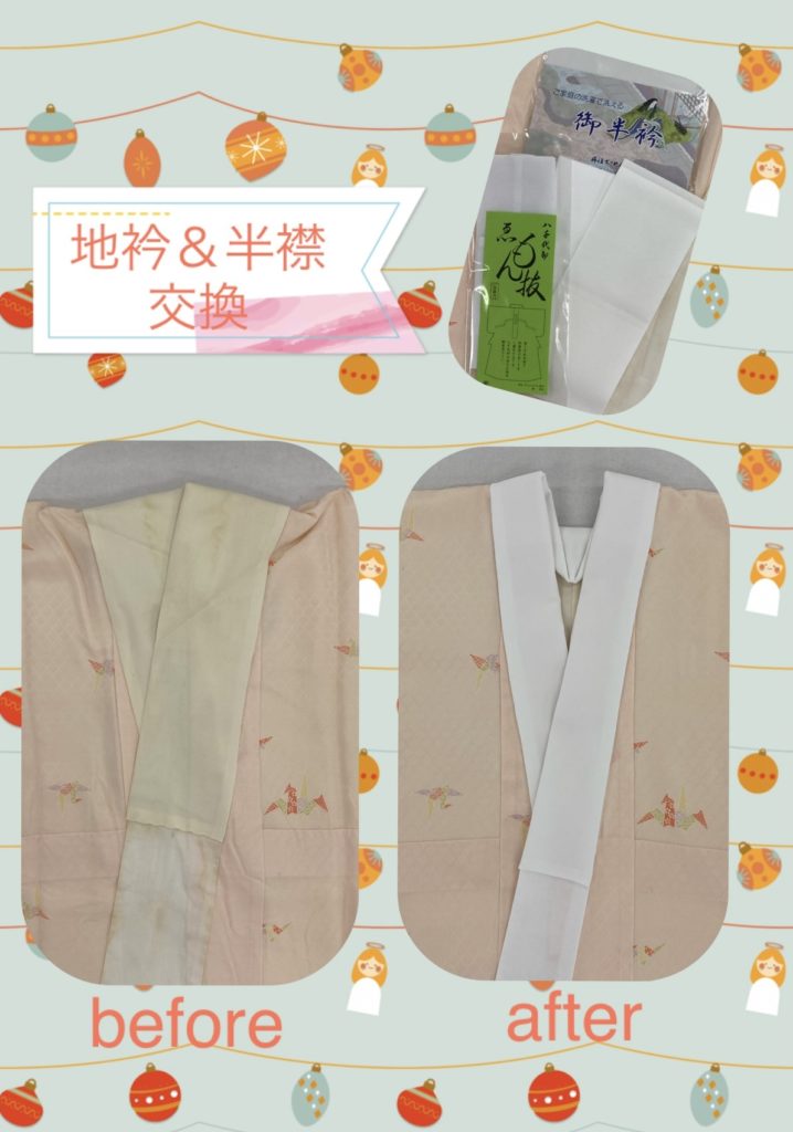 長襦袢の地衿、半衿交換をしました。