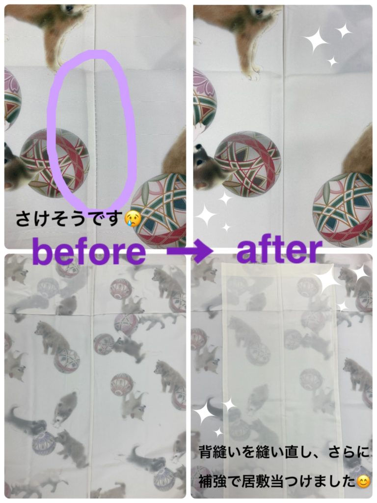 お直しの内容としては、背縫いを縫い直し、さらに補強のための居敷当てを付けました。