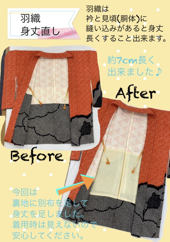 羽裏交換をするこで解決も出来ますが、今回は後ろ見頃のみ別布を足して身丈を出す事にしました。