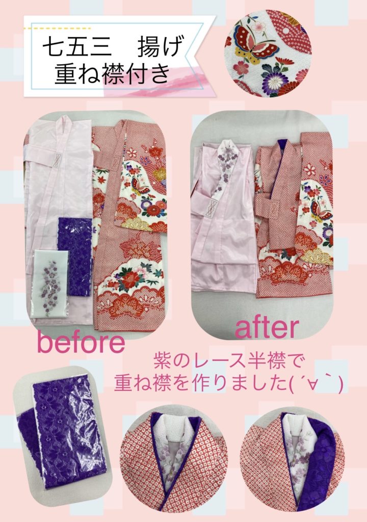 それに合わせ、紫のレース半襟で重ね襟を作り、お着物に縫い付けました。